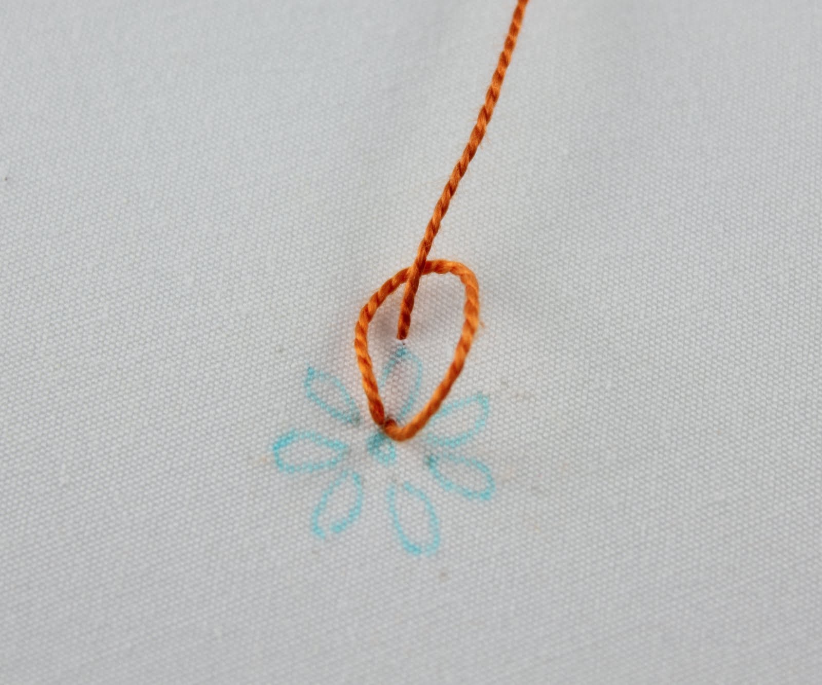 ***update*** When I first started posting about my journey through the 100 Stitches book, I mostly just took a picture of my completed stitch or line of stitching. The more comfortable I got learning these new stitches, the more I started to document the steps of the stitches as I went along. Now my 100 Stitches posts always have a step by step demonstration of my stitching. I am currently going back through my early 100 Stitches posts and adding demonstration pictures. Here is my demonstration of the lazy daisy stitch. I am using a beautiful orange dmc color variations pearl cotton floss. I started with a daisy from the Daisy embroidery pattern packet and transferred it onto my fabric: