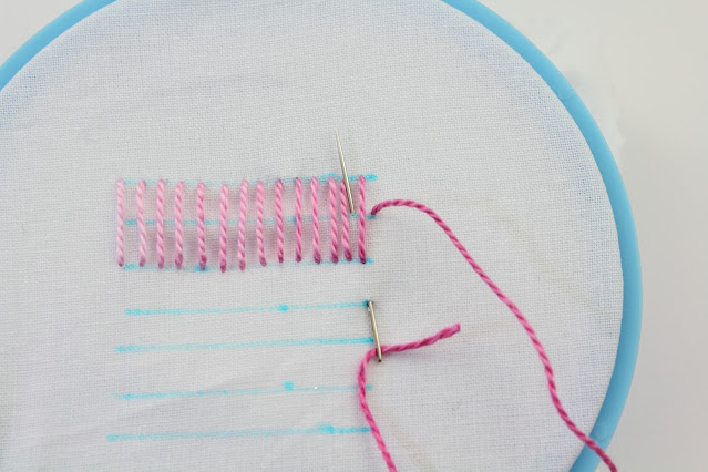 This stitch is worked both from left to right and right to left. The first step is to come up through the fabric at the left edge of the third horizontal guide line and go back onto the fabric on the first horizontal line, forming the first Straight Stitch. I just repeated these all along the lines: